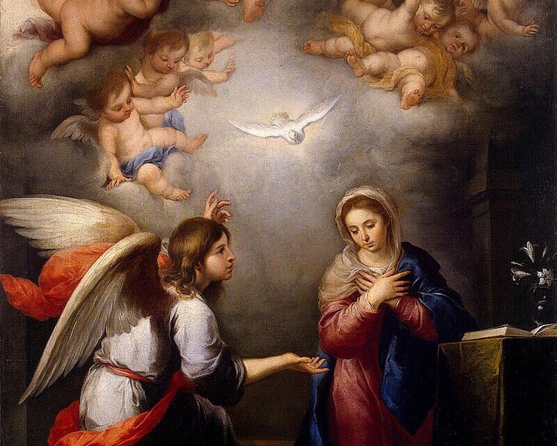 Y María dijo al ángel: «¿Cómo será eso, pues no conozco varón?». El ángel le contestó: «El Espíritu Santo vendrá sobre ti, y la fuerza del Altísimo te cubrirá con su sombra; por eso el Santo que va a nacer será llamado Hijo de Dios. También tu pariente Isabel ha concebido un hijo en su vejez, y ya está de seis meses la que llamaban estéril, porque para Dios nada hay imposible». María contestó: «He aquí la esclava del Señor; hágase en mí según tu palabra». Y el ángel se retiró.